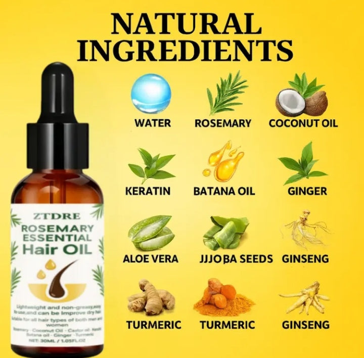 Rosemary Hair Oil 30ml/1.05fl.oz, Enriched with Rosemary, Keratin, Polygonum Multiflorum, Turmeric, and Coconut Oil. Hydrates Hair and Eyebrows for Smooth, y Softness. No Rinse Needed, Relieves Dryness and Breakage. Strengthens Hair, Multi-Benefit